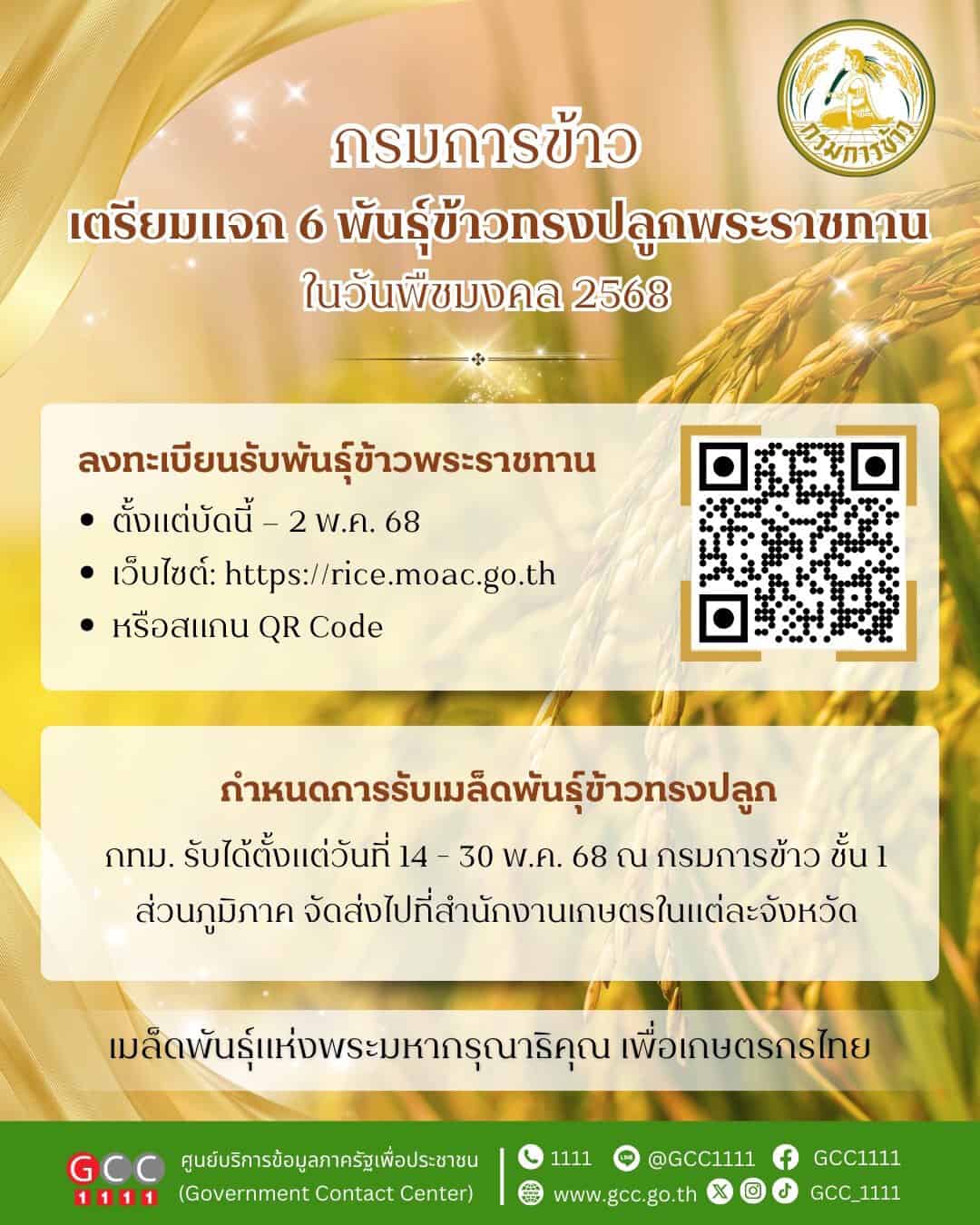 ผู้สนใจลงทะเบียนเพื่อรับ “ซองเมล็ดพันธุ์ข้าวทรงปลูก” พระราชทาน ได้แล้ววันนี้ผ่านทางเว็บไซต์ https://rice.moac.go.th หรือสแกน QR Code ที่ปรากฏในสื่อประชาสัมพันธ์ ตั้งแต่วันนี้ – วันที่ 2 พฤษภาคม 2568