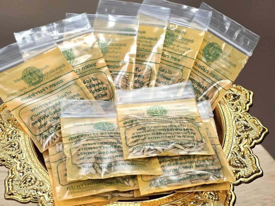 นายณัฏฐกิตติ์ ของทิพย์ อธิบดีกรมการข้าว เปิดเผยว่า เนื่องในวันพระราชพิธีพืชมงคลจรดพระนังคัลแรกนาขวัญประจำปี 2568 นี้ กรมการข้าวได้ขอพระราชทานพระบรมราชานุญาต จากพระบาทสมเด็จพระปรเมนทรรามาธิบดีศรีสินทร มหาวชิราลงกรณ พระวชิรเกล้าเจ้าอยู่หัว นำเมล็ดพันธุ์ข้าวทรงปลูกพระราชทานทั้งหมด 6 พันธุ์ จำนวน 2,590 กิโลกรัม นำเข้าพระราชพิธีพืชมงคลจรดพระนังคัลแรกนาขวัญ ซึ่งจะจัดขึ้นในวันศุกร์ที่ 9 พฤษภาคม 2568 และนำไปบรรจุซองพลาสติก จำนวน 400,000 ซอง เพื่อแจกจ่ายให้ผู้สนใจและชาวนาทั่วประเทศ รับไปเป็นมิ่งขวัญและสิริมงคล ประกอบ