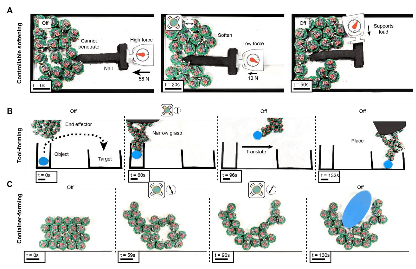 นักวิจัยจาก University of California ซานตาบาร์บารา และ Dresden University of Technology ได้พัฒนาหุ่นยนต์ที่สามารถไหลได้แบบของเหลว แต่ก็เปลี่ยนเป็นของแข็งได้ โดยหุ่นยนต์ไม่ได้มาแค่ตัวเดียว แต่จะทำงานร่วมกันเป็นกลุ่มหลาย ๆ ตัว พวกมันสามารถรวมตัวหรือแยกตัวออกจากกันก็ได้ และเมื่อพวกมันสามารถปรับเปลี่ยนรูปทรงได้อย่างอิสระแบบนี้ ก็เลยจะมีประโยชน์มาก ๆ ในการสำรวจพื้นที่ต่างๆที่เข้าถึงยาก แต่ก็รวมตัวกันสร้างโครงสร้างแข็งๆ เช่น สะพานหรือรูปทรงที่ต้องรับน้ำหนักได้