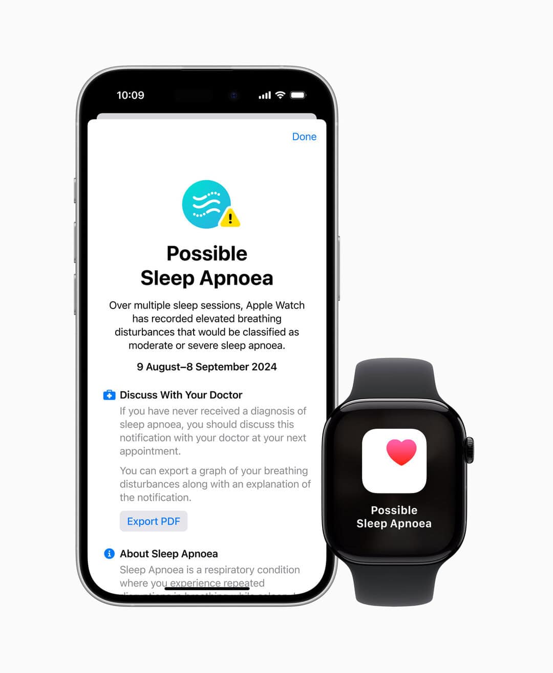 ทุก 30 วัน จะมีการวิเคราะห์ข้อมูลการรบกวนการหายใจ และจะแจ้งเตือนผู้ใช้หากพบสัญญาณของภาวะหยุดหายใจขณะหลับระดับปานกลางถึงรุนแรงอย่างต่อเนื่อง เพื่อให้ผู้ใช้สามารถปรึกษาแพทย์เกี่ยวกับขั้นตอนต่อไป รวมถึงการวินิจฉัยและการรักษาที่อาจเกิดขึ้น Apple Watch รุ่นใหม่ที่ใช้ watchOS 10 ขึ้นไป และจับคู่กับ iPhone ที่รัน iOS 18.1 ขึ้นไป สามารถตรวจจับสัญญาณของ ภาวะหยุดหายใจขณะนอนหลับ (Sleep Apnea) ได้ โดยจะมีการแจ้งเตือนหากพบความเสี่ยง เพื่อให้ผู้ใช้สามารถรับรู้และปรึกษาแพทย์ได้อย่างทันท่วงที