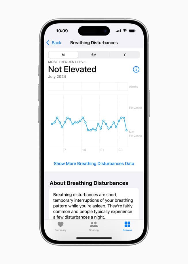 โดย Apple Watch จะใช้เครื่องวัดความเร่งเพื่อติดตามการเคลื่อนไหวเล็กๆ น้อยๆ ที่ข้อมือที่เกี่ยวข้องกับการหยุดชะงักของรูปแบบการหายใจปกติ ซึ่งวัดภาวะหายใจผิดปกติ แม้ว่าความผิดปกติเหล่านี้บางอย่างจะเป็นเรื่องปกติ แต่ก็มีความสำคัญที่ต้องติดตาม เนื่องจากสามารถใช้เพื่อช่วยให้เข้าใจถึงการนอนหลับพักผ่อน และหากเกิดขึ้นบ่อยครั้งติดต่อกันหลายคืน อาจเกี่ยวข้องกับภาวะหยุดหายใจขณะหลับ ผู้ใช้สามารถดูภาวะหายใจผิดปกติของแต่ละคืนได้ในแอป Health บน iPhone และ iPad โดยจะจัดประเภทว่าสูงหรือไม่สูง และสามารถดูย้อนหลังได้เป็นเวลาหนึ่งเดือน หกเดือน หรือหนึ่งปี “ภาวะหยุดหายใจขณะหลับแบบอุดกั้น (Obstructive sleep apnea) เป็นความผิดปกติทางการนอนหลับที่พบบ่อยและร้ายแรง เนื่องจากมักไม่ได้รับการวินิจฉัย การตระหนักรู้และการตรวจพบภาวะหยุดหายใจขณะหลับตั้งแต่เนิ่นๆ จึงเป็นก้าวสำคัญที่น่ายินดีและนำไปสู่การนอนหลับที่ดีต่อสุขภาพและคุณภาพชีวิตที่ดีขึ้น” ดร. มอยรา จุง ซีอีโอของมูลนิธิสุขภาพการนอนหลับ กล่าว