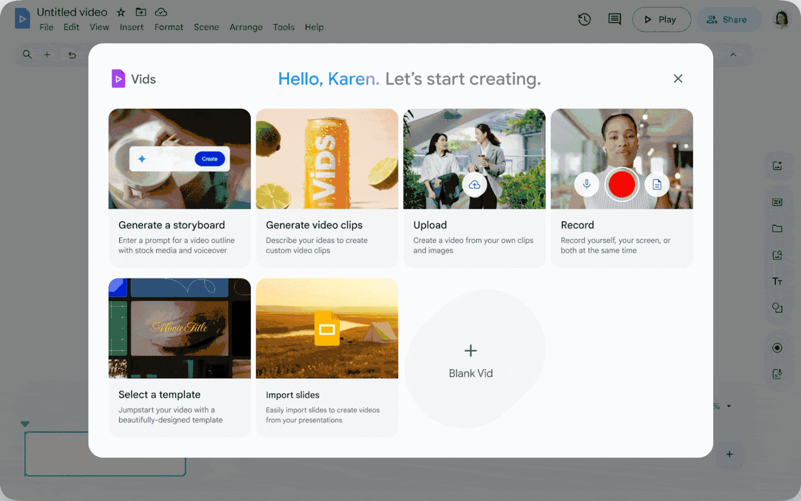 ฟีเจอร์ “Import Slides” ช่วยให้คุณดึงไฟล์งานนำเสนอ Google Slides มาสร้างเป็นวิดีโอใน Google Vids ได้ทันที พร้อมจัดองค์ประกอบสไลด์ให้กลายเป็น “ฉาก” (scene) อัตโนมัติ คุณสามารถเลือกสไลด์ทั้งชุดหรือเฉพาะบางหน้า แล้วปรับแต่งต่อได้ตามต้องการ ไม่ว่าจะเป็น