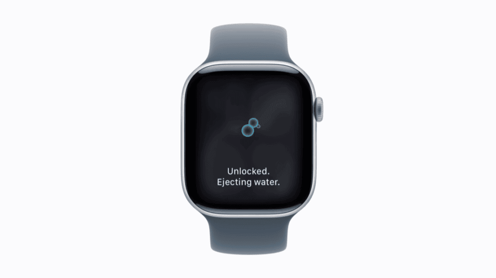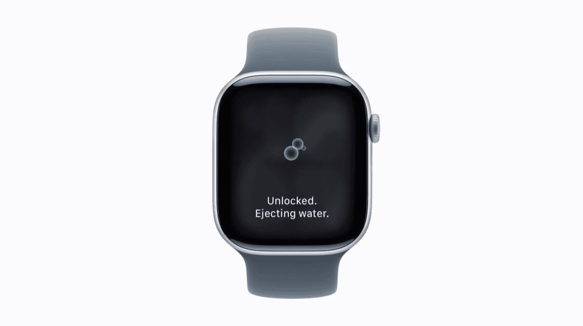 ไล่น้ำ: กด Digital Crown ค้างไว้ แล้วหมุนจนกระทั่งหน้าจอแสดงคำว่า “ปลดล็อกแล้ว” (Unlocked) Apple Watch จะส่งชุดเสียงออกมาเพื่อขับน้ำที่เหลืออยู่ในช่องลำโพงออก