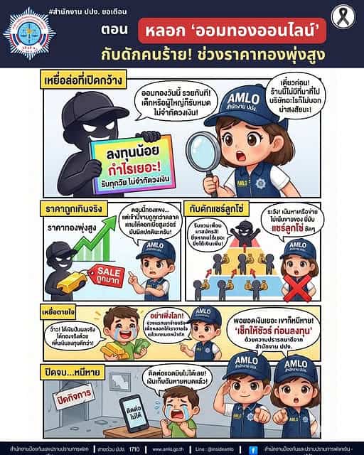 ระวัง! หลอกออมทองออนไลน์ โดยในช่วงที่ราคาทองคำผันผวนและมีแนวโน้มสูงขึ้น มิจฉาชีพมักใช้โอกาสนี้แอบอ้างการออมทอง มาเป็นเหยื่อล่อ โดยเน้นไปที่กลุ่มคนที่อยากลงทุนแต่มีงบจำกัด หรืออยากได้ผลกำไรที่รวดเร็ว หากคุณพบเห็นโฆษณาชวนเชื่อในลักษณะนี้ โปรดเช็กให้ชัวร์ก่อนโอนเงิน!