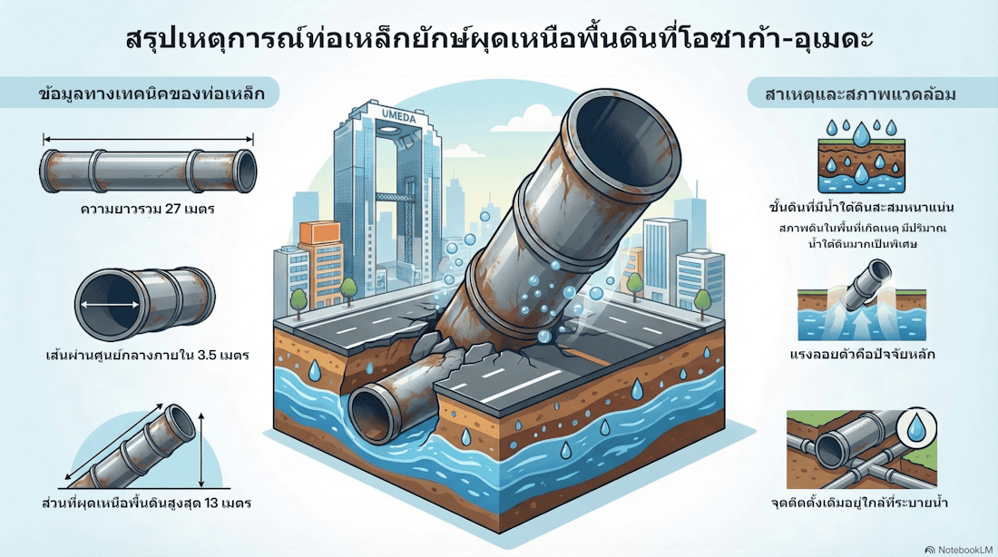 ท่อยักษ์กลางโอซาก้า โผล่ทะลุถนน กลายเป็นประเด็นไวรัลไปทั่วโลกโซเชียล เมื่อเกิดเหตุระทึกขวัญกลางย่านอุเมดะ (Umeda) แหล่งธุรกิจสำคัญของเมืองโอซาก้า ประเทศญี่ปุ่น เมื่อท่อเหล็กขนาดมหึมาจากโครงการก่อสร้างใต้ดินพุ่งทะลุพื้นถนนขึ้นมาสูงกว่า 13 เมตร สร้างความแตกตื่นให้กับผู้สัญจรไปมาเป็นอย่างมาก