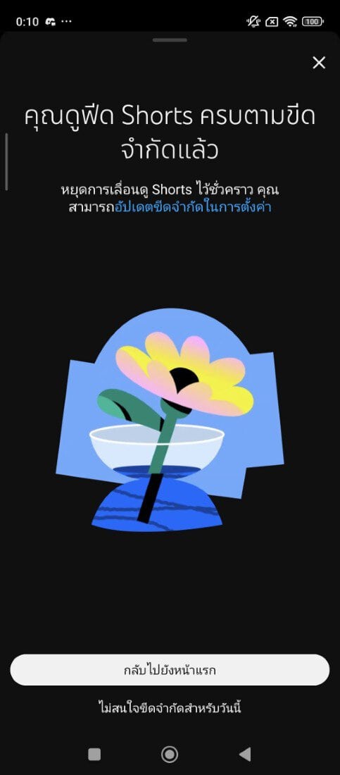 เมื่อคุณดูวิดีโอในฟีด Shorts จนครบเวลาที่ตั้งไว้ หรือหากตั้ง 0 วินาทีละก็ ระบบจะแสดงข้อความแจ้งเตือนบนหน้าจอเพื่อบอกว่าคุณใช้งานถึงขีดจำกัดแล้ว