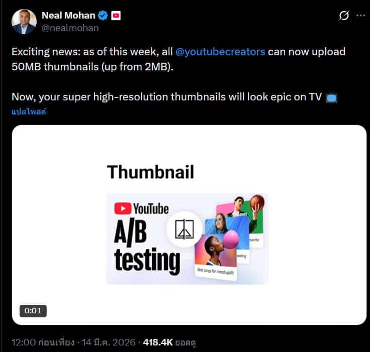 YouTube Thumbnail อัปโหลดรูป 50MB ได้แล้ว ข่าวดีสำหรับเหล่าคอนเทนต์ครีเอเตอร์ทั่วโลก เพราะ YouTube ประกาศขยายขีดจำกัดขนาดไฟล์รูปภาพหน้าปกวิดีโอ (Thumbnail) จากเดิมที่จำกัดเพียง 2MB ได้เพิ่มขึ้นเป็น 50MB เพื่อรองรับการแสดงผลที่คมชัดบนหน้าจอขนาดใหญ่